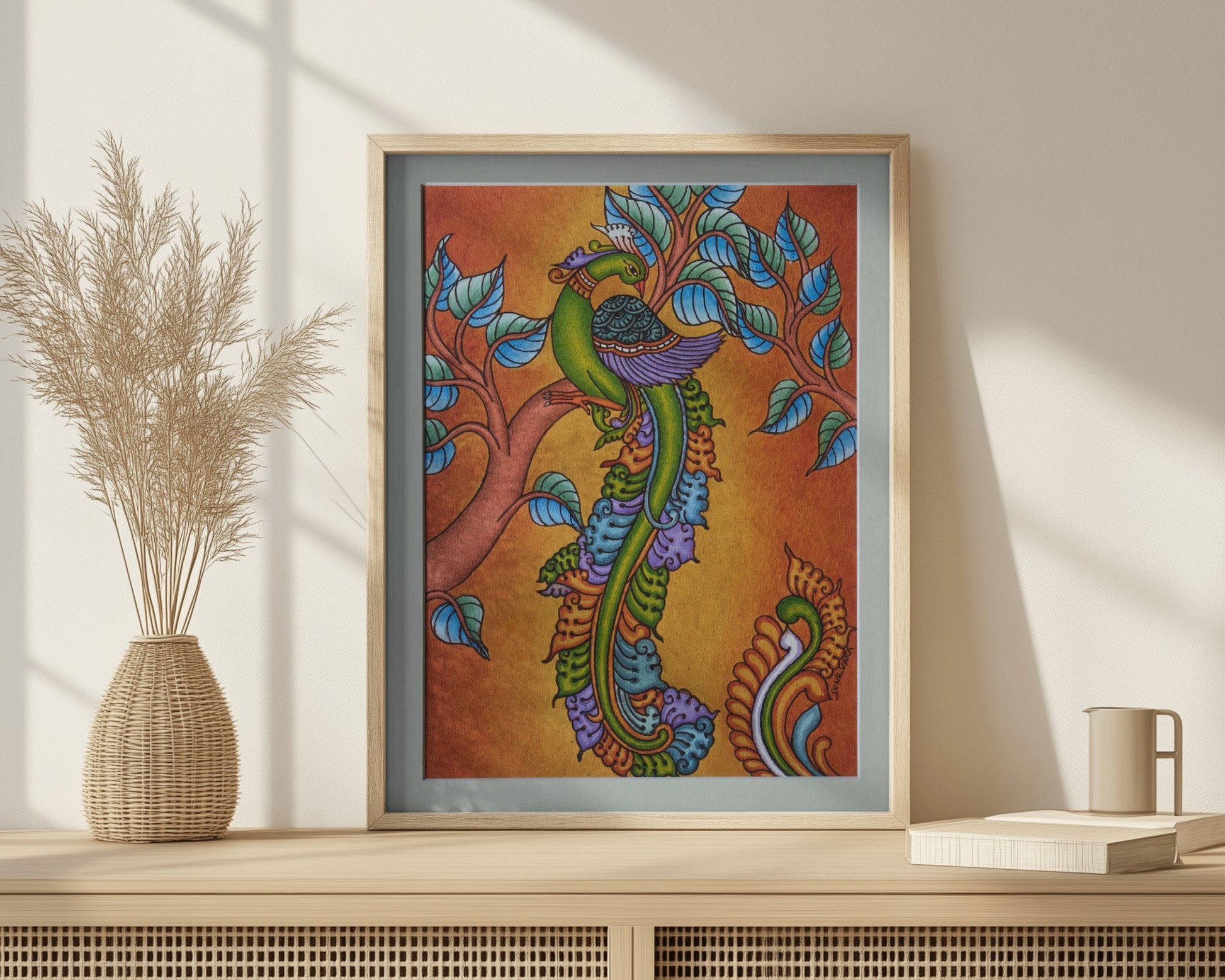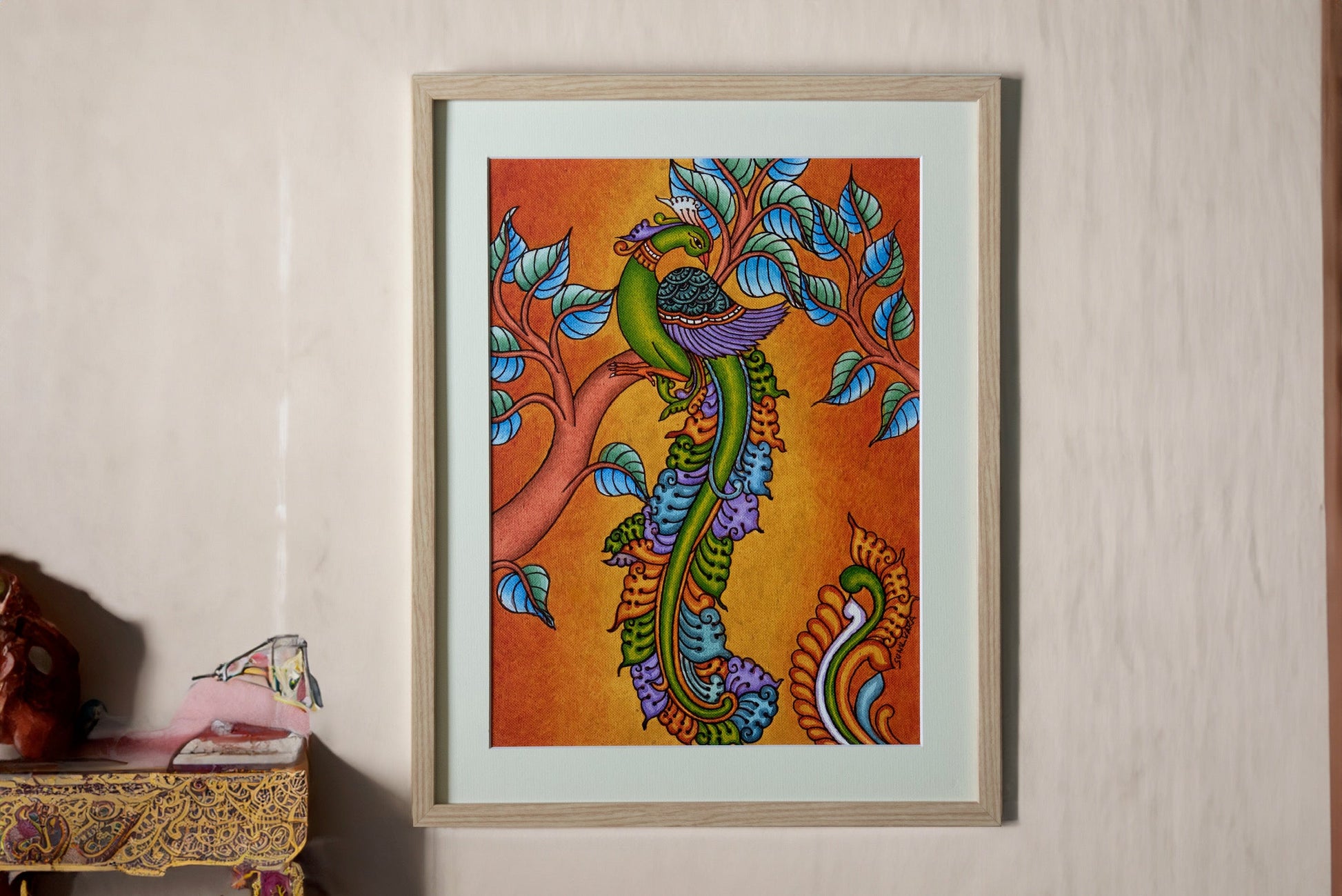 Panchavarna, or Kerala Mural Paintings, originate from the 8th century AD and are traditionally painted using five colors: white, black, yellow, green, and red. These murals were originally found on temple walls, and are still present across Kerala today. In modern times, artists mix the primary colors to create new shades like pinks and purples, allowing for a modernization of this ancient art form.