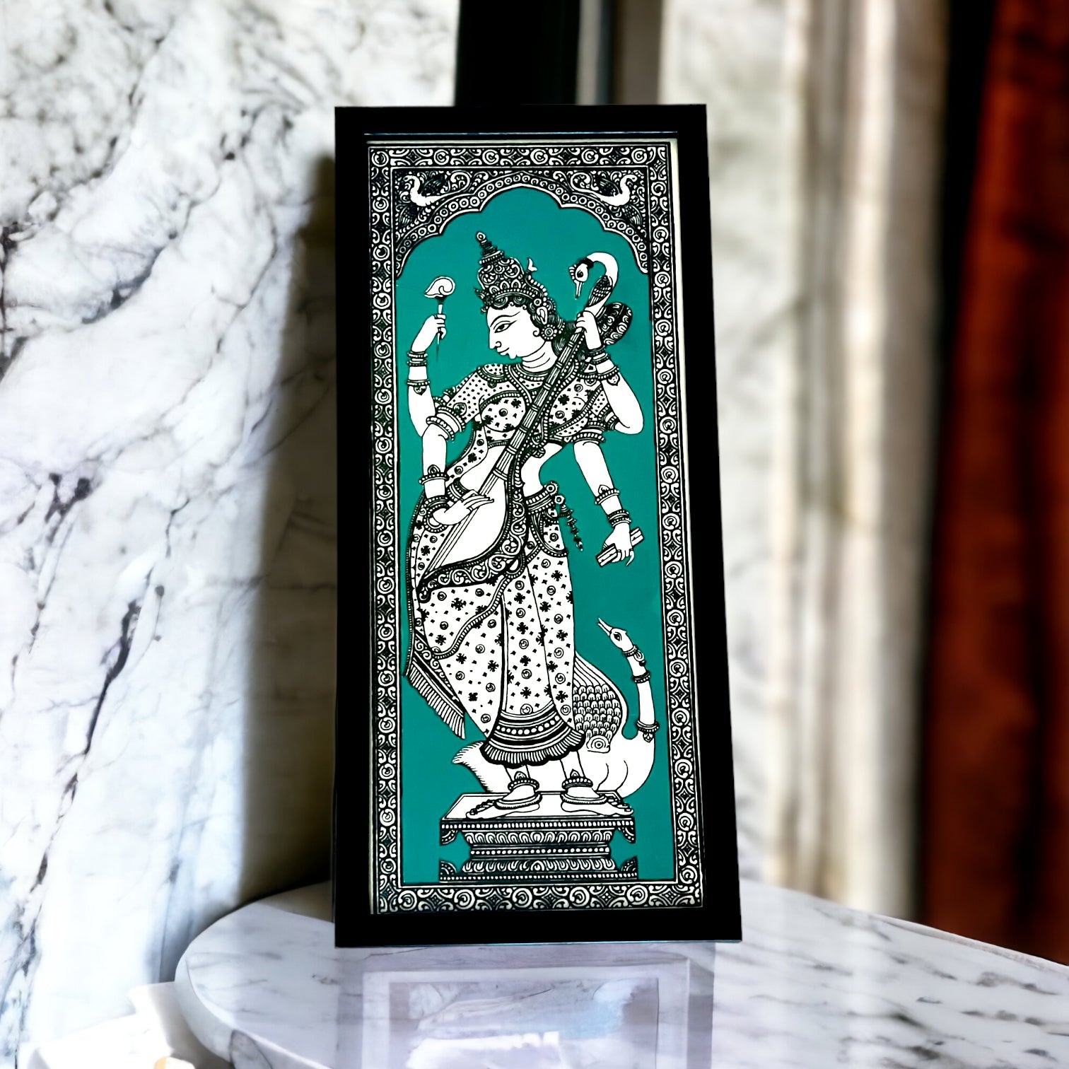 About: The painting comes framed in black acrylic frame. The paintings are hand painted on tussar silk. Because silk cloth is so delicate, they are mounted on paper first before framing.